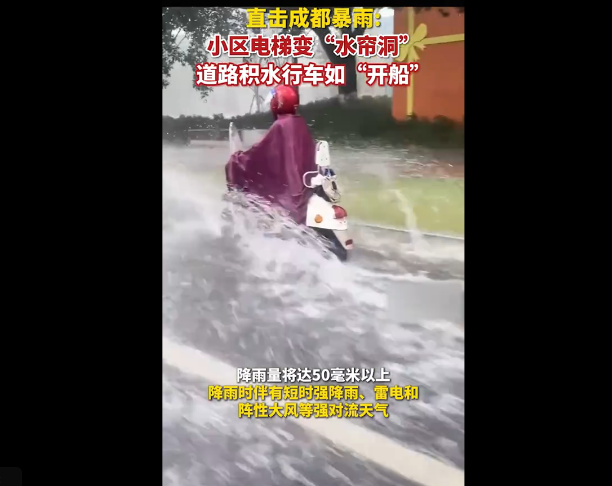 四川成都遭遇暴雨天气:小区电梯变“水帘洞”,道路积水行车如“开船”...