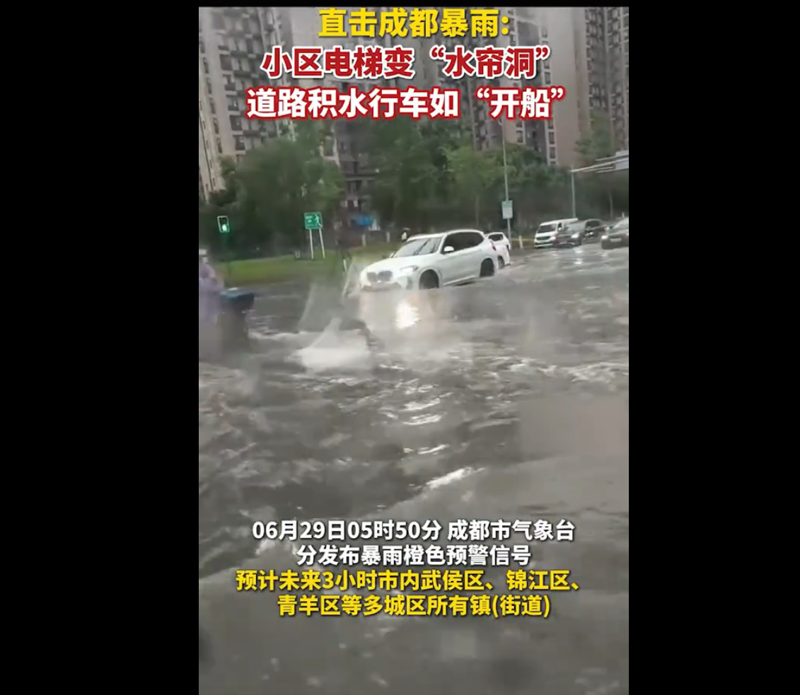 四川成都遭遇暴雨天气:小区电梯变“水帘洞”,道路积水行车如“开船”